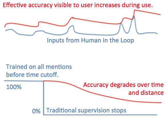 For example, active learning is a hot area in both natural language processing and information retrieval. Since the entire ground truth data will be available, you can simulate different modes of training, such as those illustrated in the time series diagrams to the right.